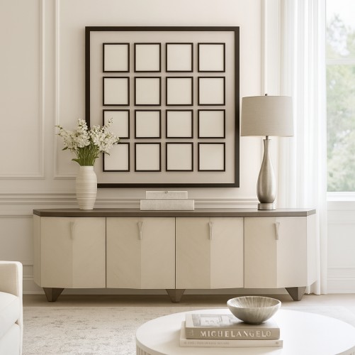 A vision of tailored elegance, the Fantosini Media Cabinet makes a statement in any refined living space. Its softly angled, architectural silhouette is wrapped in oak veneers and finished in a radiant silver mist, bringing a subtle shimmer to its sculpted lines. The contrasting top offers depth with a smooth, smoky tone that draws the eye. Inside, a combination of fixed and adjustable shelving offers versatile storage solutions, while the expansive surface is perfect for supporting televisions up to 88 inches or showcasing your luxe décor.