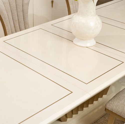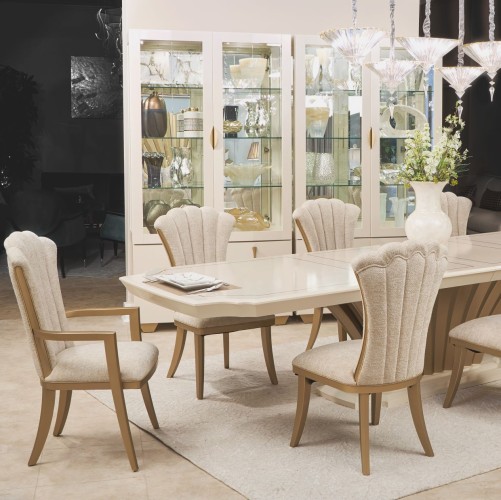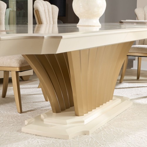 Host with distinction and dine in pure elegance. The Fantosini Rectangular Dining Table commands attention with its graceful curves, lustrous finishes, and iconic silhouette. Its expansive tabletop, crafted from oak veneers in a silver mist finish, radiates a dramatic sunburst pattern that draws the eye and sets the tone for elevated entertaining. A delicately painted trim outlines the top, highlighting every angle of its sculpted edge. At its foundation, a dramatic fluted pedestal base in a luminous silver finish anchors the table with Art Deco-inspired grandeur. Designed to impress, this expandable masterpiece comfortably seats up to twelve, making it the centerpiece of your most elegant soirées.