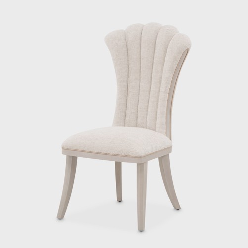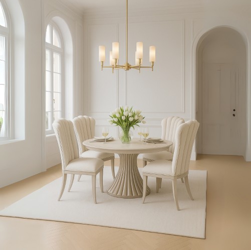 Refined and radiant, the Fantosini Round Dining Table and Side Chair brings sculptural elegance and artistic detail to your dining space. The tabletop is adorned with an oak sunburst veneer in a soft silver mist finish, enhanced by a hand-painted trim that emphasizes its graceful, curving silhouette. Below, the base steals the spotlight with dramatic Art Deco flair—its fluted pedestal glistens in silver, offering a timeless sense of glamour. The channel-tufted backrest fans outward in a sweeping silhouette, drawing inspiration from classic shell motifs with a modern twist. Upholstered in a plush chenille fabric in a soft, natural tone, the chair pairs tactile warmth with luminous detail. Grounded by rubberwood legs, this piece offers refined seating with a designer’s eye for form. Flared legs complete the silhouette, making it a sophisticated choice for both ends of the table. Perfect for intimate gatherings, this table seats up to five and instantly elevates every meal into an experience.