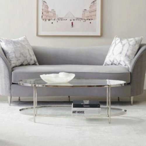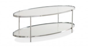 A refined ornament of attention in any room, this classic oval-shaped cocktail table features a clear glass top and shelf with a Polished Stainless Steel frame. Sleek in scale, with ample space for storage and display, above and beneath. The perfect complement to our curvaceous Farrah sofa and Farrah round end tables.
