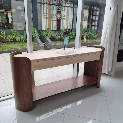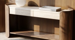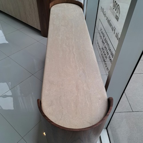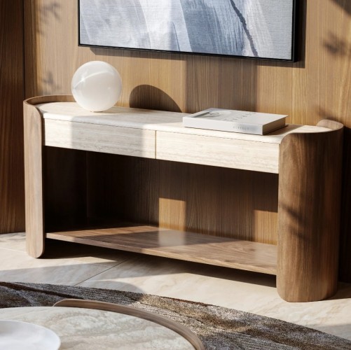 The Fleur Console Table exudes timeless charm, featuring an unfilled Travertine top complemented by its elegant Porcini-finished case. Its graceful silhouette offers a striking blend of contemporary chic and classic refinement.