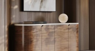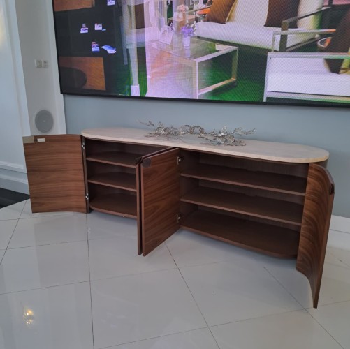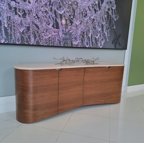 Elevate your dining experience with the Fleur Sideboard. A stunning unfilled Travertine top combines gracefully with its refined Porcini finish, bringing a sophisticated elegance to your space.