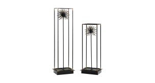 An interpretation in metal of flowering dandelions encased in steel frames, finished in an aged black with golden highlights. Sizes: S-6x16x5, L-6x21x5