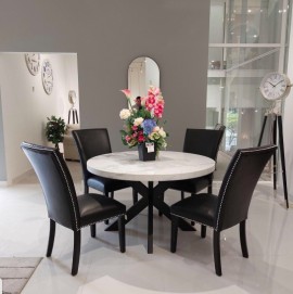 Rural charm gets a modern update in this farmhouse-inspired table, featuring a sturdy base in a weathered industrial style metallic finish and a plank-style oak veneer top. The table comfortably seats six for those who love entertaining and large family gatherings.