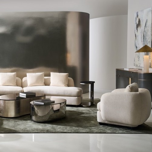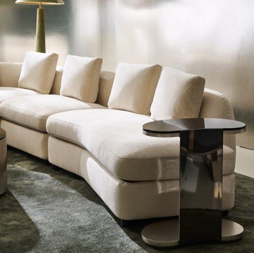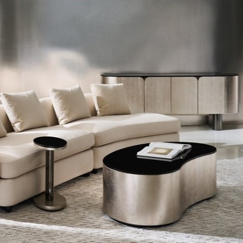 Inspired by Klimt’s belief in the inseparable being of thing, these nesting tables are works of art from every angle. Their bean- and oval-shapes of varying sizes shine with Smoked Bronze glass on top, wide curved and spherical Deep Bronze metal legs, top and bottom wood panels dressed in Charcoal Leaf and a sleek plinth base in Almost black. Pair the tables together, or arrange them separately, they will make a statement either way.