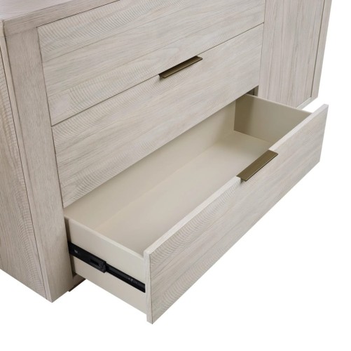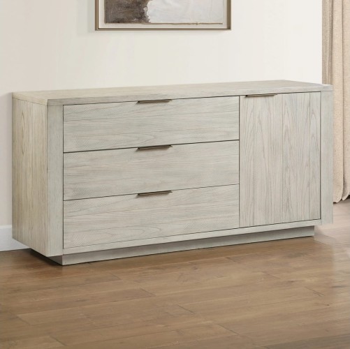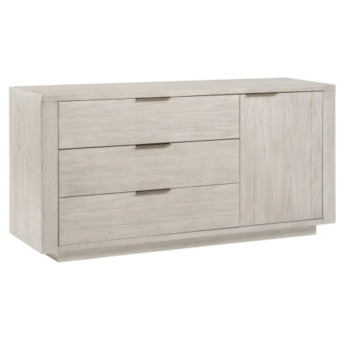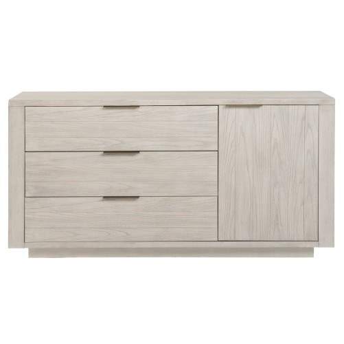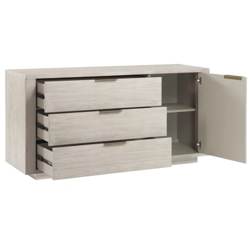 The Steve Silver Garland Sand Server combines contemporary design with practical storage, making it a versatile addition to any dining space. Built from sturdy wood and finished in a lightly distressed sand color, this piece features clean lines and a modern plinth base that adds a sleek, grounded look. Satin brass hardware enhances its simple elegance without overpowering the natural grain of the wood. With three drawers and one cabinet door, the server offers ample room to store dinnerware, linens, or serving essentials. Whether used on its own or paired with the matching Garland dining collection, the Steve Silver Garland Sand Server brings functional style to your home.