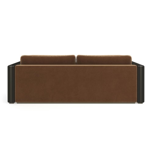 Mid-Century style has been updated with sumptuous materials and finishes. This large, square-armed piece showcases a fully-upholstered seat in a luxurious Chestnut Mohair blended fabric. The inviting bench seat features a single loose Springdown cushion and two loose blend down pillow backs in matching fabrics. Flanked on each end are squared wooden arms finished in high-gloss Chocolate Truffle with thin inset bands and bases in gleaming Whisper of Gold.