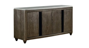 The handsome Geode Topaz Credenza has a gently bowed front, rounded corner posts and neatly shaped conical feet. The mixed media design combines a solid wood body veneered in handsomely grained cerused white oak, an inset top of striated travertine, and embedded metal drawer pulls in a tumbled bronze finish.
