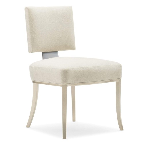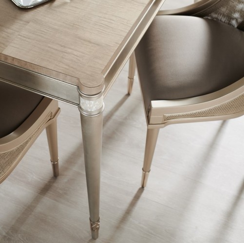 Pull up a chair and enjoy a signature dining experience with this remarkable table. Every gathering will feel special around its classically elegant profile and softly shimmering surfaces. White Mother of Pearl inlays accents its upper legs while a Moonlit Sand finish highlights the tabletop and Soft Silver Leaf gives its apron and legs their opulent appearance. Metal ferrules in Whisper of Gold provide a finishing touch. Minimal in form, this distinctive dining table features a classic design brought to life with luxe finishes and details that convey a whole new level of luxury.