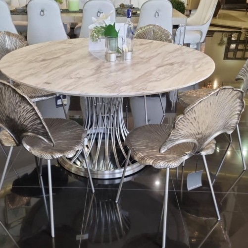 Make an artistic statement in your dining space with this stunning metal chair. This finely detailed piece is crafted from cast aluminum with a gingko leaf pattern on the seat and back. The shiny nickel finish adds an industrial sheen that's guaranteed to turn heads.