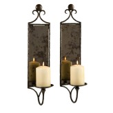 Antiqued mirror reflects the dancing light of pillar candles in this set of two wall sconces, eloquently devised with their hammered metal design.