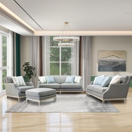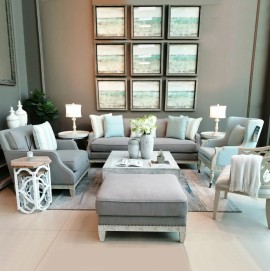 Understated elegance is personified in Hancock Park with unique tailoring details and exposed wood base frames. A lovely Pewter base cloth is the backdrop for cool spa shaded accent pillows and the sloping clipped arms gracefully come down the base to rest upon a carved antique white painted frame. A tight back adds simplicity and formality above sumptuous and generous loose cushion reversible seats on the sofa, loveseat and chair while two wonderful accent chairs with exposed wood complete the ensemble.