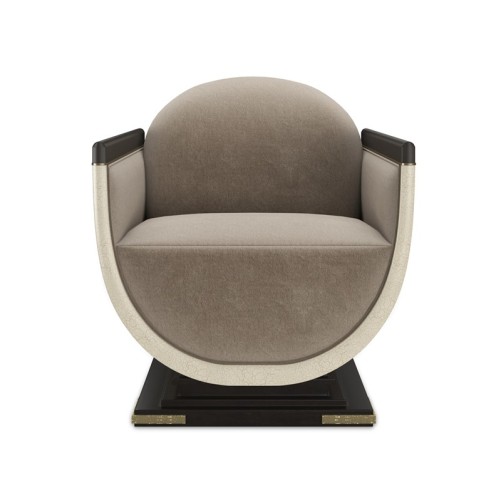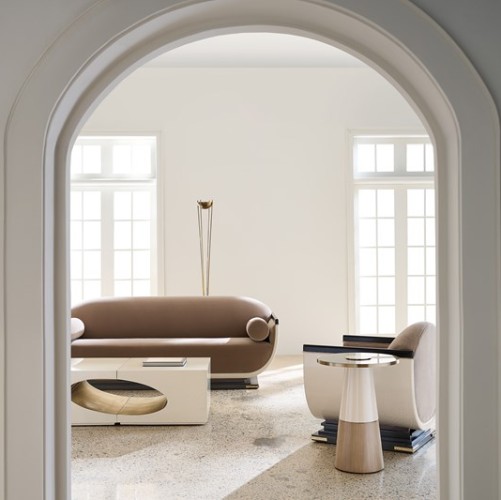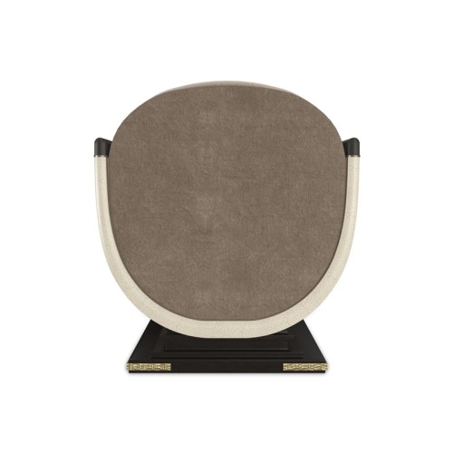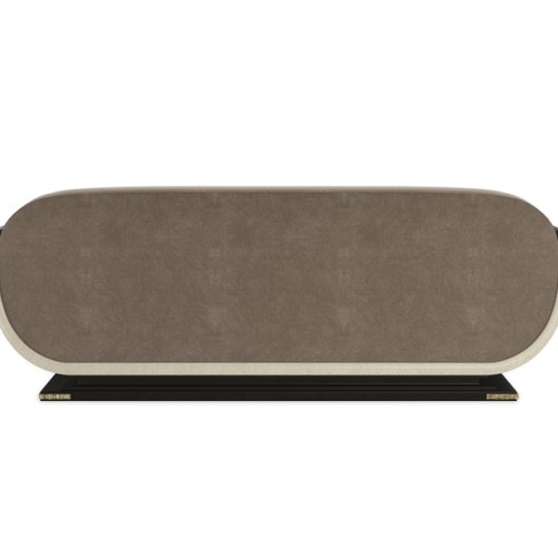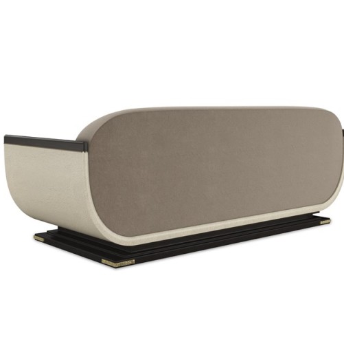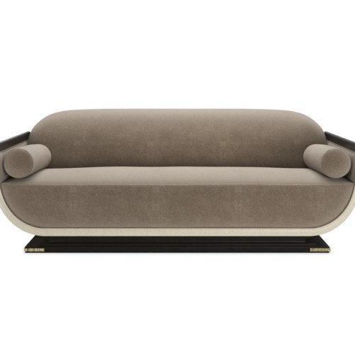 A modern interpretation of classic Roman shapes, this sofa is remarkable for its length and deep-scooped wood frame with an Ivory Craze crackled finish that is trimmed with Brushed Gold paint. The frame is perched on a wood-tiered base in Charred Bark with Brushed Gold metal corner appliques. This regal chairs inside frame and plush cushion showcase a faux mohair velvet fabric in Mushroom.