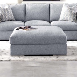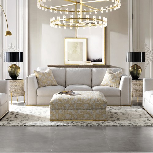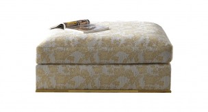 Heyer Ottoman - Gold The cocktail ottoman is a square, padded centerpiece that is safe for children with its padded sides and top. Can be used for sitting, serving, or for just putting your feet up. With its clean lines, fun reef pattern and coffee finish tapered legs, this is a gold line transitional to traditional style.