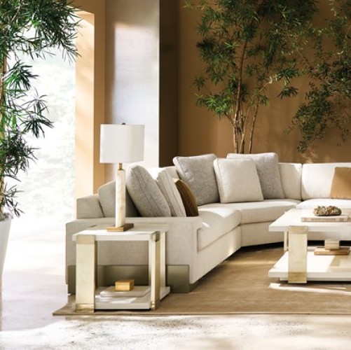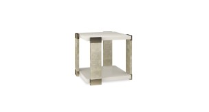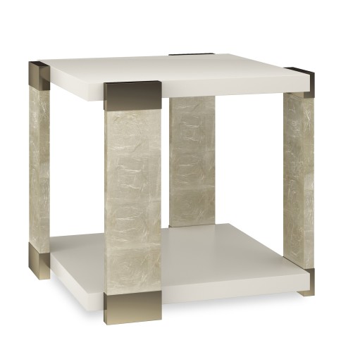 This square end table brings a beautiful balance of linear forms and light. Its Almond Milk tabletop and shelf appear to float within Oracle hand-applied leaf wood posts, for a look that stirs interest, without imposing. Whisper of Gold metal accents trim the top and bottom of each post to create shimmer and moments for reflection.
