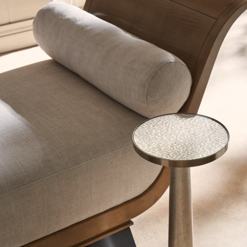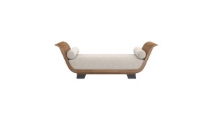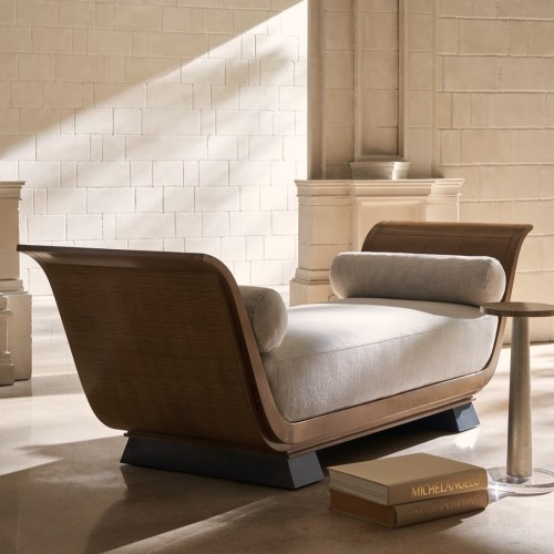 With a nod to Greek and Roman antiquity, this chaise introduces lounge-like comfort and a classic undertone. Its daybed form recalls pieces used throughout history to lounge comfortably yet respectably in the presence of guests. Dressed in a light-toned linen with matching bolster pillows, warmly contrasted by an arcing frame in Toasted Sycamore and plinth legs in a rich Charred Bark finish. Style in a seating area designed for conversations or use it to separate two designated spaces in a room.