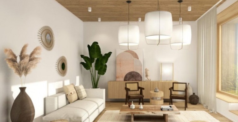 Palet warna dominan meliputi putih hangat, cream, abu lembut, cokelat muda, dan variasi kayu natural. Material seperti kayu oak ringan, linen, rotan, dan tekstil organik sering digunakan untuk menciptakan suasana hangat tanpa berlebihan.