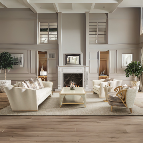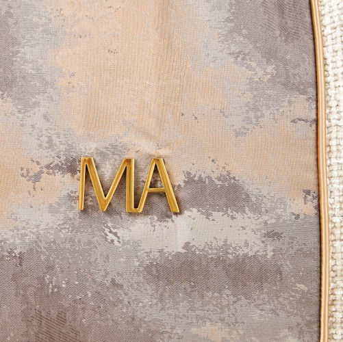 Seating area wrapped in plush Cappuccino jacquard chenille, complemented by a woven jacquard exterior.