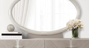 Curves and soft edges shine within the clean lines of contemporary style. The Lanterna Dresser Mirror is made to sit beautifully on the dresser and tie your bedroom aesthetic together. Modern elegance is found here! The Lanterna collection was designed with chic style and contemporary glamour in mind. Smooth Silver Mist finishes, acrylic and stainless steel accents,and sleek curves give this line the luxury ambience guaranteed to light up any home.