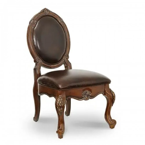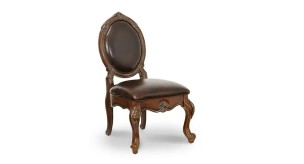 The Lavelle Melange collection by Michael Amini is a thoughtful reimagination of his earlier Lavelle collection. It features dark woods with a stunning melange finish and green and gold fabrics. Ornate embellishments decorated with a gold leaf pattern adorn the pieces, and antiqued hardware finishes off the look.