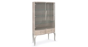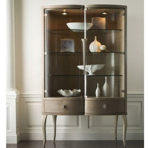Instantly elevating, this shapely, glass-door bar cabinet mixes beauty and functionality for a versatile style that’s reflective of the Art Deco era. Light-toned finishes showcase the exquisite woodgrains of koto and figured sycamore veneers, balanced by the warm glow of Soft Radiance paint. Features a lit interior with three adjustable glass shelves for storing spirits or collectibles. Two drawers offer additional space for keeping linens and other entertaining essentials.