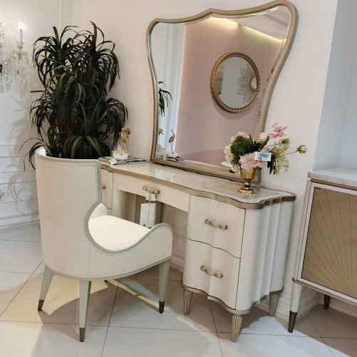 Make a statement guaranteed to last! Sloping arms, champagne finishes, and velvet seating will let you show off your elegant style in the best way. Chair is upholstered in velvet with a single diamond tuft Chair’s wood frame, armrests, and legs are finished in platinum. Elevating any occasion, the Valentina arm chair introduces a soft, sculptural silhouette, with low profile arms and a comfortably rounded back, accentuated by exposed wood trim in a Matte Pearl finish. Made for entertaining and gathering with friends, Valentina is impeccably dressed in a cream and gold textural woven that’s easy to clean.