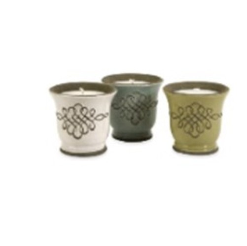 Simply illuminating, this set of three candles in ceramic holders is a nice touch to tabletop, shelf or mantle.