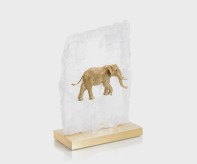A beautifully carved wax and hand-cast elephant appears to be on parade on a semitransparent piece of selenite mounted on a brass base.