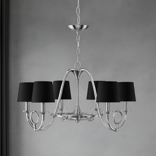 Marielle is a transitional design that blends equal parts luxury and glamour. Graceful arms in a chic Chrome finish sweep outward to create an opulent yet airy feel. Each arm supports two light sources covered by rich black silk, gold lined shades for refined drama.