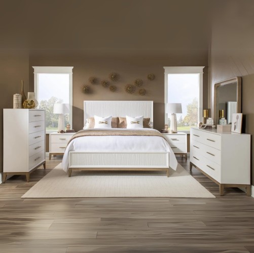 The Melrose collection marries a clean, sleek aesthetic with an organic warm wood finish in a casual contemporary design. The bedroom can work in a variety of interiors from an upscale coastal feel to modern lodge or bohemian. Crafted of Hardwood Solids with Oak Veneers, the collection mixes the pure white Cloud painted finish with the warm Desert Oak finish on Oak Veneers. Simple, slim-lined horizontal bar pull hardware is in a Golden Sand finish.