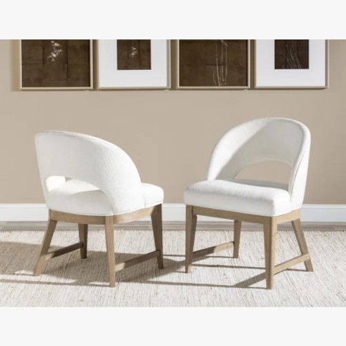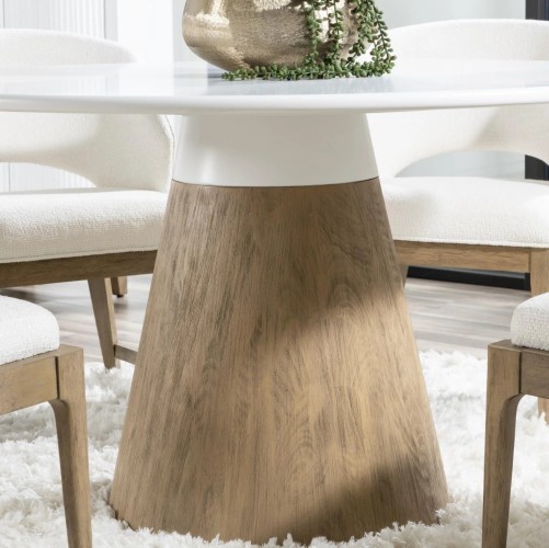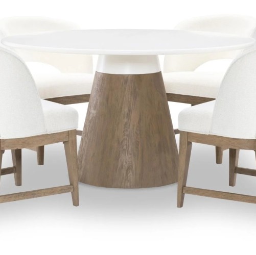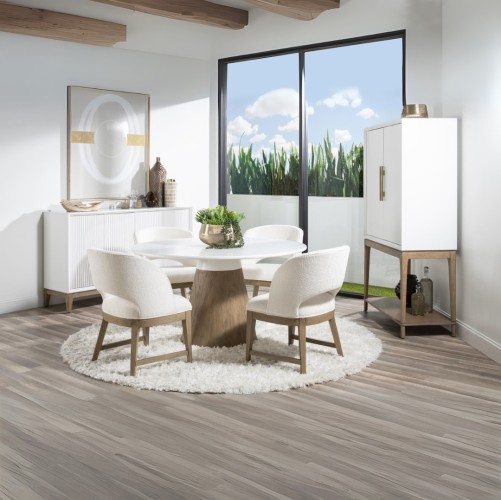 The Melrose Dinning Set collection marries a clean, sleek aesthetic with an organic warm wood finish in a casual contemporary design. The bedroom, dining and occasional collection can work in a variety of interiors from an upscale coastal feel to modern lodge or bohemian. Crafted of Hardwood Solids with Oak Veneers, the collection mixes the pure white Cloud painted finish with the warm Desert Oak finish on Oak Veneers. Simple, slim-lined horizontal bar pull hardware is in a Golden Sand finish.