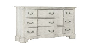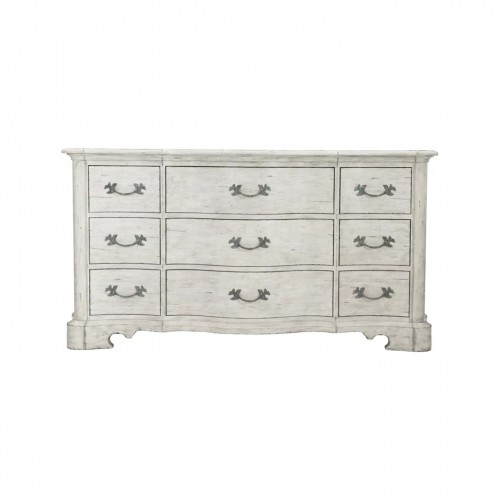 Store your clothing in stately traditional style with this Dresser. The piece boasts a whitewashed cotton finish that pairs beautifully with the ornamental handle hardware and elegantly shaped base. As storage goes, you receive nine spacious drawers perfect for all of your clothing and accessories.