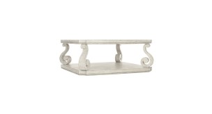 An airy and delicate aesthetic is combined with a stately design for this gorgeous Square Cocktail Table. The piece boasts a white whitewashed cotton finish that pairs beautifully with the robust scroll legs. The wood shelf base provides a perfect spot for display, while included casters make it extremely easy to move this table around.