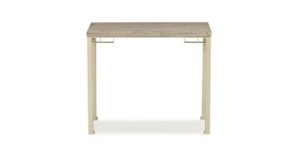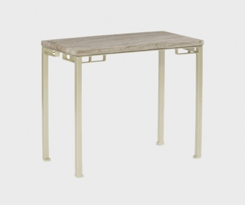 Small stone and metal tables are the most versatile pieces in any room. A beautiful piece of Silver Travertine graces the top of this rectangular side table. Perfect for an urban loft or paired to contemporize a more traditional environment, the veins of this stone give off a natural wood-like appearance. The travertine sits on a warm Jazzy Taupe metal base that has an architectural grill-like frame. This piece is authentically modern with its geometric appearance.