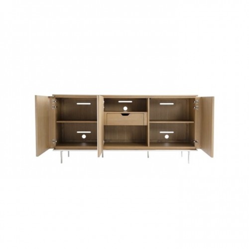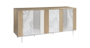 Geometric styling is the hallmark of the Modulum collection and this buffet showcases the best of that design inspiration. Vertical panels of wood, stainless steel, and faux marble create a striking pattern over three push-to-open doors. Inside are both fixed and adjustable shelves, grommets and vents, as well as one soft-close drawer. The buffet rests on a metal base and six legs.