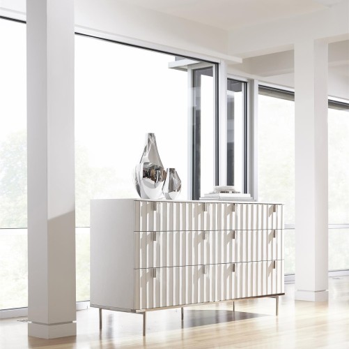 Modulum has a soft modern feel with chic, livable style. The look is relaxed and understated with clean lines, bright sophistication and a fresh, effortless appeal. In the Modulum collection, clean lines and a flawless balance of materials combine with relaxed sophistication for a look that's bright, fresh, and effortless. There are midcentury references in this stunning bed, but with a modern update. A metal framed headboard and footboard are complemented with upholstered panels for a perfect textural balance. The soaring height of the headboard is allowed to draw all eyes as the footboard takes a low profile.