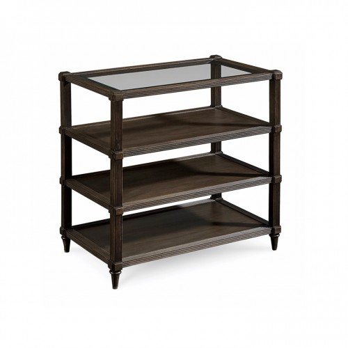 Beautifully simple. This tiered set of shelves is open and airy with inset glass surfaces. Reeded posts and frames allow this item to pair nicely with the Ellman cocktail, or to be used as a lighter bedside option.