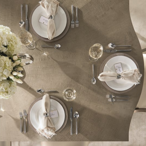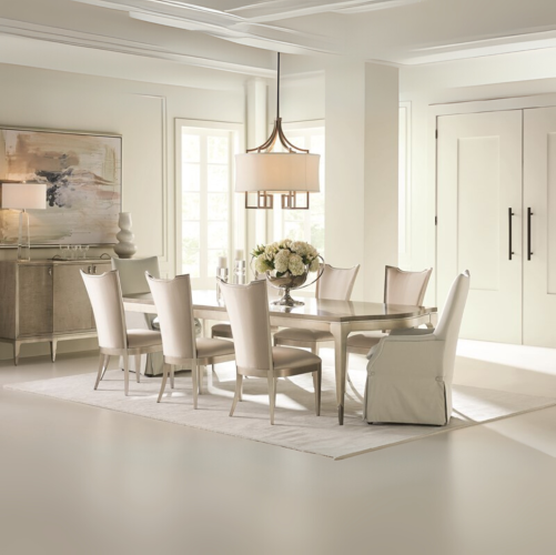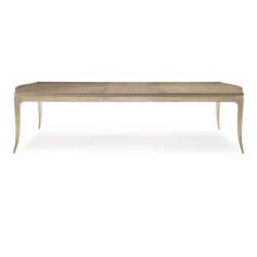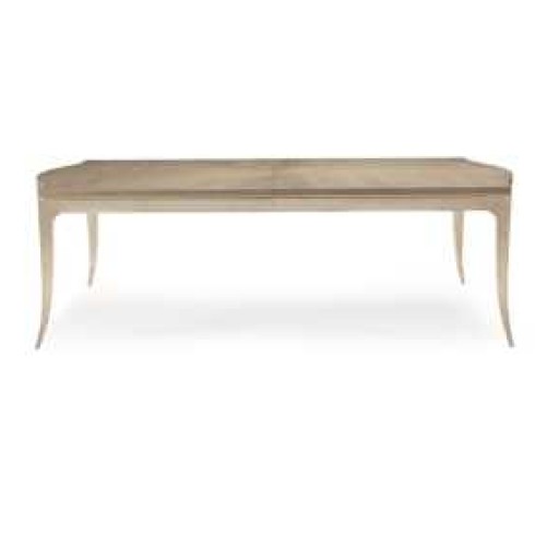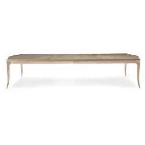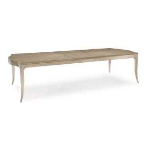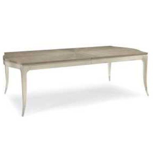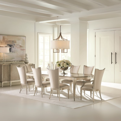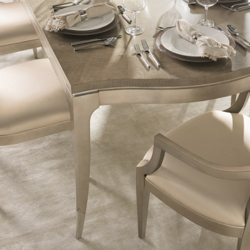 Set the table, set the mood with this elegantly shaped dining table. Its Silver Curly Maple top wears a Moonlit Sand finish while its legs and apron are highlighted with Soft Silver Leaf. Smartly designed to expand for entertaining, this gracious table boasts a finished length of 144 inches with the addition of its two 24-inch leaves. Metal ferrules add a distinctive finishing touch to its legs. Luxury New Dining Chair Home Modern and Simple
