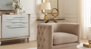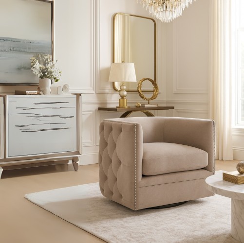 The Palazzo Swivel Chair puts a modern spin on a traditional form, delivering an eclectic feel. Button tufting and nailhead trim create a sophisticated look, while the curved shape provides luxurious support and softens the flow of a room. Handcrafted of engineered hardwood and polyester