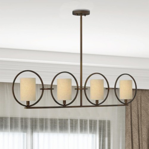 The stunning chic design of Pandora creates a distinctive statement with intersecting rings that capture cylindrical shades for a soft yet geometric style. A rich Brushed Cinnamon finish adds a luxurious feel to this timeless yet striking collection.
