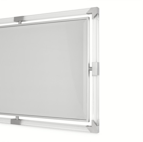 Frame is acrylic, and corner accents and center bands are brushed stainless steel