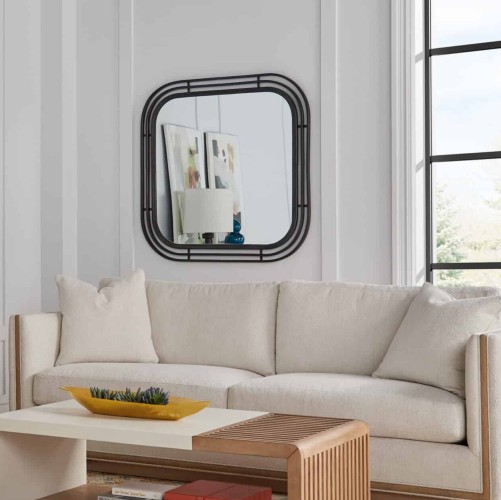 Wide open design possibilities await with this extra-long 153.5″ W headboard, sure to be the statement piece of any bedroom. The generously proportioned frame is constructed of sleek upholstered panels that evoke the massive feeling of contemporary architecture. The subtle accent of a wooden footboard base adds a hint of contrast to this strikingly modern bed. The contemporary lines of this artistic collection inspired this chic two-tone nightstand, combining a sleek white top and plinth base with the warmth of natural wood grain and oversized horizontal drawer pulls. Two drawers provide plenty of space for essential accesso. Structure and symmetry define the architecturally inspired Portico collection, exemplified by this dresser. The sleek white top and plinth base add a light touch, surrounding the textural beauty of warm, sienna wood finish. Six large drawers provide plenty of storage space for a fashion-forward wardrobe, unified by overscale horizontal matte black pulls in this eye-catching piece. Nothing is more fashionable than black. This chic mirror makes a statement in matte black metal, composed of concentric squares with curved edges. This simple yet striking frame turns every reflection into a gallery-worthy work of modern art.