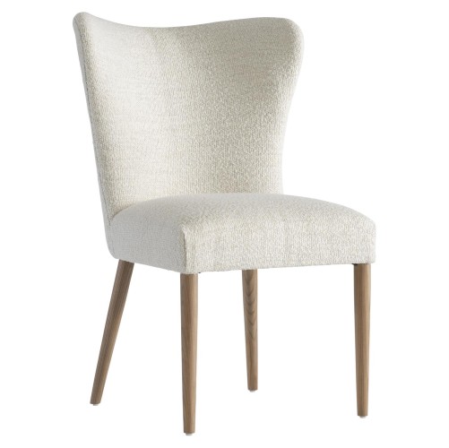 This side dining chair is inspired by the geometric forms of modern art and architecture. An exposed wood frame finished in warm sienna brown surrounds a gently curved backrest, fully upholstered in a creamy neutral woven fabric. Simple and sophisticated, this chair brings comfort and style to the table.