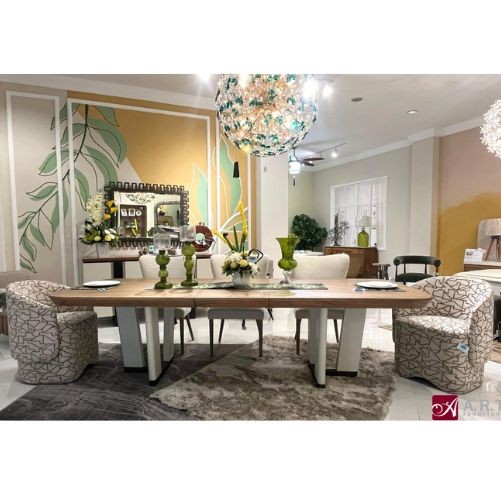 A dual pedestal, two-tone base evokes the strength and beauty of architectural columns in this substantial 90-in dining table. The elegant beauty of natural wood grain in a radiating pattern provides a striking contrast that juxtaposes organic and modern style. A 20-in leaf extends the table to 110-in, comfortably seating eight. The softer side of modern minimalism comes to the table with this upholstered arm chair. An exposed wood frame finished in warm sienna brown is perfectly complemented by the sophistication of a tailored fabric seat in a creamy neutral woven fabric.