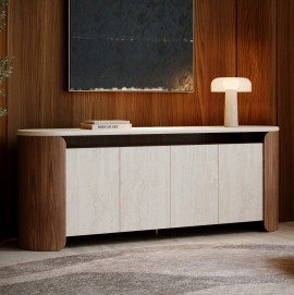 The eye-catching facade of this storage cabinet provides room for six convenient drawers and four adjustable shelves behind its four doors. The versatile piece can be used as an attractive dining room sideboard, and features a spacious length and wire management for lamps and electronic equipment that makes it perfect as a media cabinet in the living room. The two-tone body of the sideboard is finished in almond and white shades that accent its grooved facade, while the round metallic drawer pulls are a subtly antique-style design. Feature: Four (4) doors with soft close hinges and magnetic latches. Six (6) adjustable shelves behind doors (Middle 2: 27.9-in W x 17.8-in D; Side 4: 13.9-in W x 17.8-in D). Six (6) drawers for storage (Top 4: 9.43-in W x 15-in D x 4.84-in H; Bottom 2: 9.43-in W x 15-in D x 6.2-in H). Four (4) wire management holes on back side. Dimension :W 254CM / 310CM D 107CM H 76CM Material : Ash & Pine Solid, Plank-Effect Flakey Oak and Pine Veneer We