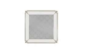 This charming cocktail table mixes intricate details with a soft gold finish for an effervescent style that draws the eye, without imposing. A mirrored bottom shelf etched in Soft Silver leaf creates intrigue and introduces a repeating geometric pattern. Square legs in a Whisper of Gold are perfectly positioned to offset arcing corners and uphold a beveled glass top set within a slender, double frame. Pairs perfectly with our Simply Charming and Third Time’s a Charm end tables.