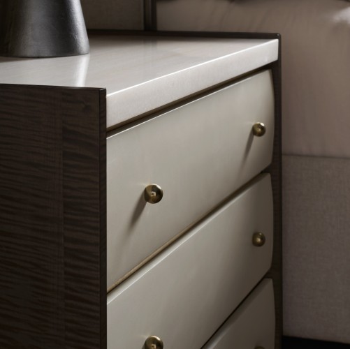 With a rustic elegance reminiscent of rural France, this nightstand features tactile drawer fronts in a Rockport Burnished Adobe finish. Drawing the eye to its architectural design: a striated white onyx marble top, warmly contrasted by end panels in Craftsman Bronze Paint and an Antique Bronze Leaf dentil molding detail along the base. Features creamy Almond Milk-painted drawer interiors and ball hardware in Brushed Gold for an accentuating element that ties it to our Provence bed.