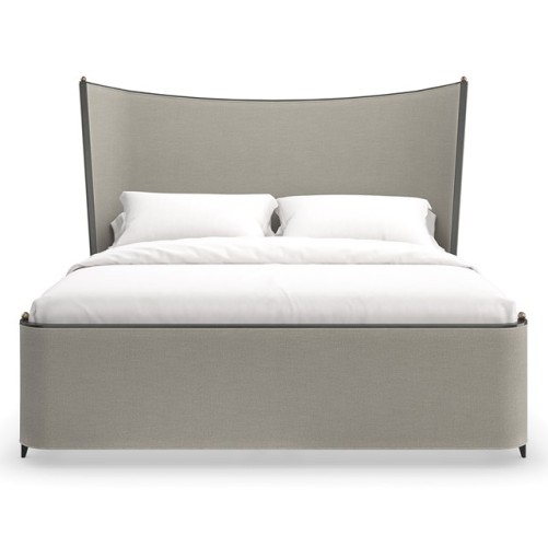 A contemporary take on French traditionalism, this beautifully upholstered bed recalls the exquisite metalwork of wrought iron furniture found in patio gardens. Features an exposed wood frame with tapered metal legs in Craftsman Bronze Paint, accentuated by decorative balls and a warm, gray fabric with the look and feel of luxurious Belgian linen. Pairs perfectly with our Toulouse bench for an evocative yet elegant finish.