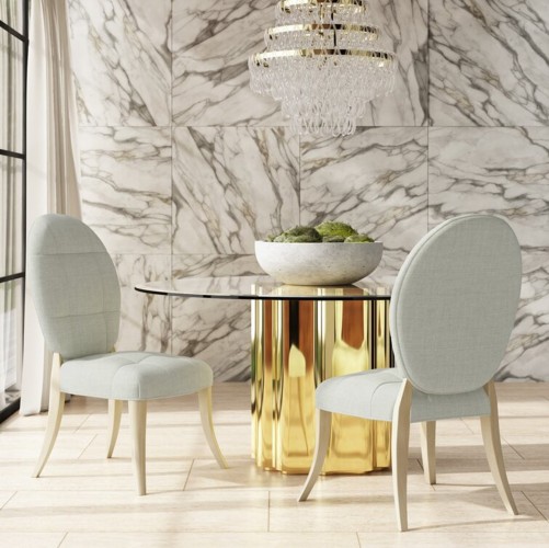 The Savoy Place collection by Bernhardt is sophisticated and glamorous. The Savoy Place Arm Chair is the perfect dining chair for an elegant and neo-traditional interior. Its modern shape and cleanliness is also very feminine Savoy Side Chair