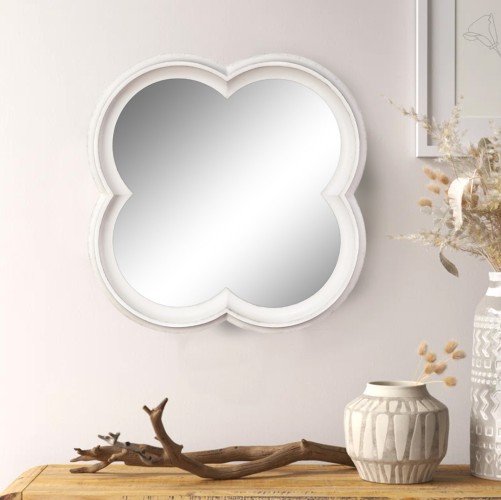 Want to have a special mirror to bright your farmhouse home? Wall-amound mirror shape like a Quatrefoil in full bloom, the wooden frame features a whitewashed finish for a rustic vibe. The modern farmhouse look of its design gives this small mirror a warm casual feel - a style that goes with and complements most home decor.